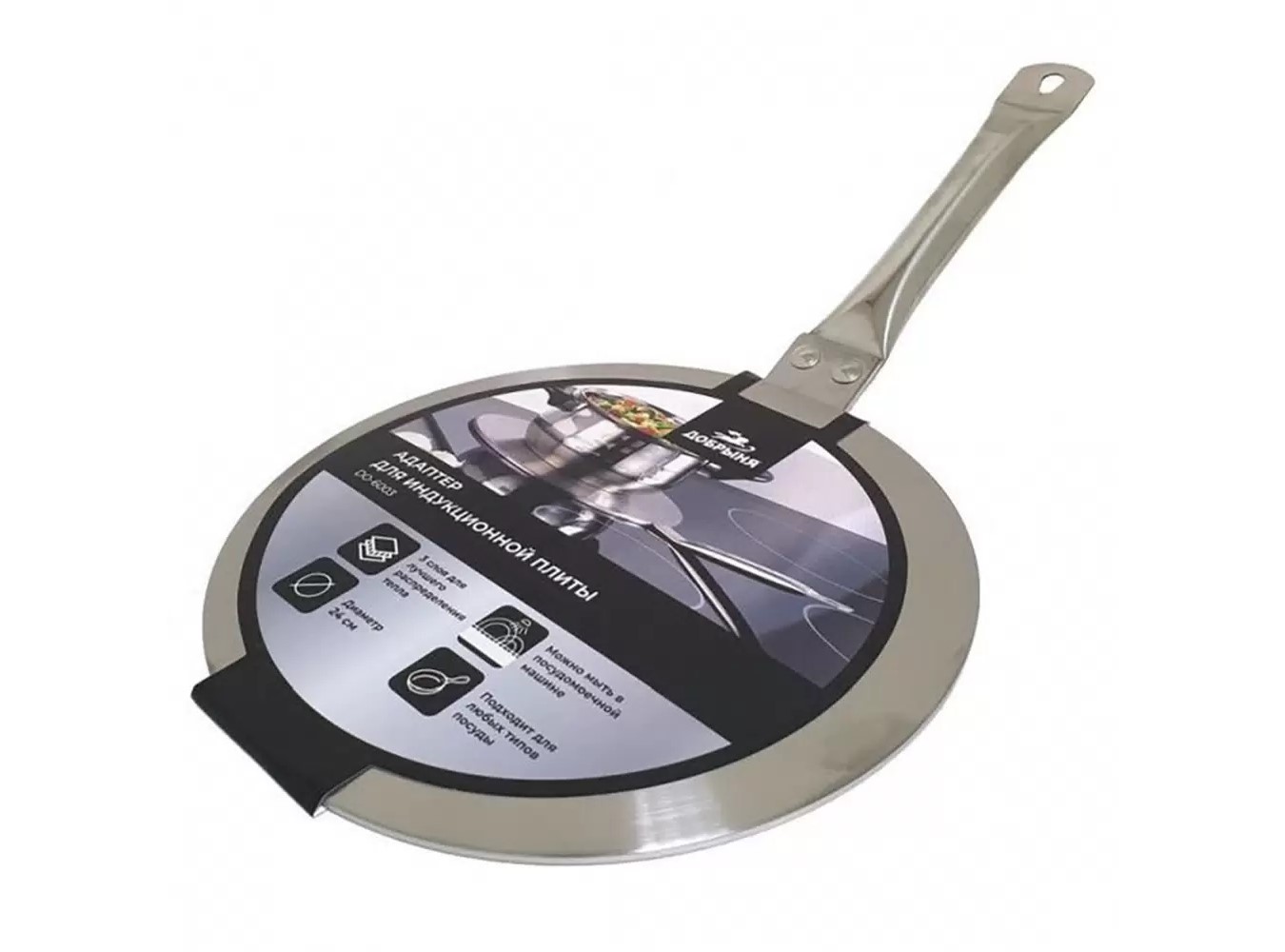 Изготовленный из нержавеющей стали и алюминия, адаптер имеет диаметр 24 сантиметра и толщину дна 3 миллиметра. Он легко устанавливается на плиту и обеспечивает равномерное распределение тепла по всей поверхности.