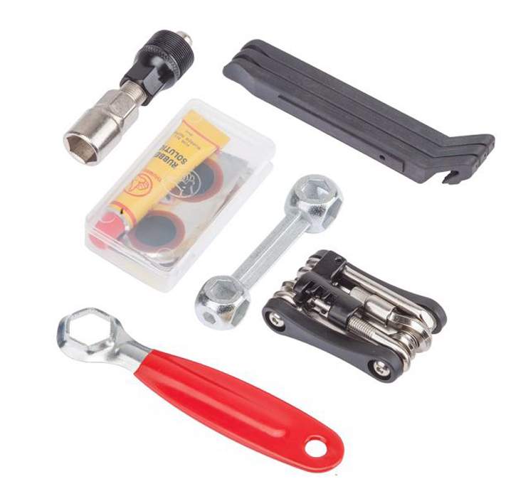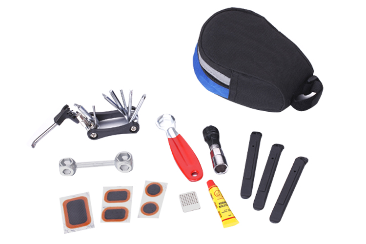 Набор велоинструментов KL-9812B из 6-ти предметов в велосумке: складной набор из шестигранников 2/2.5/3/4/5/6 мм - отвертки под шлиц/крест - головки под внешние шестигранники 8/9/10 мм - открытые ключи 8/10/15 мм - ниппельный ключ, шиномонтажные лопатки, насос, наждачка, 2 заплатки