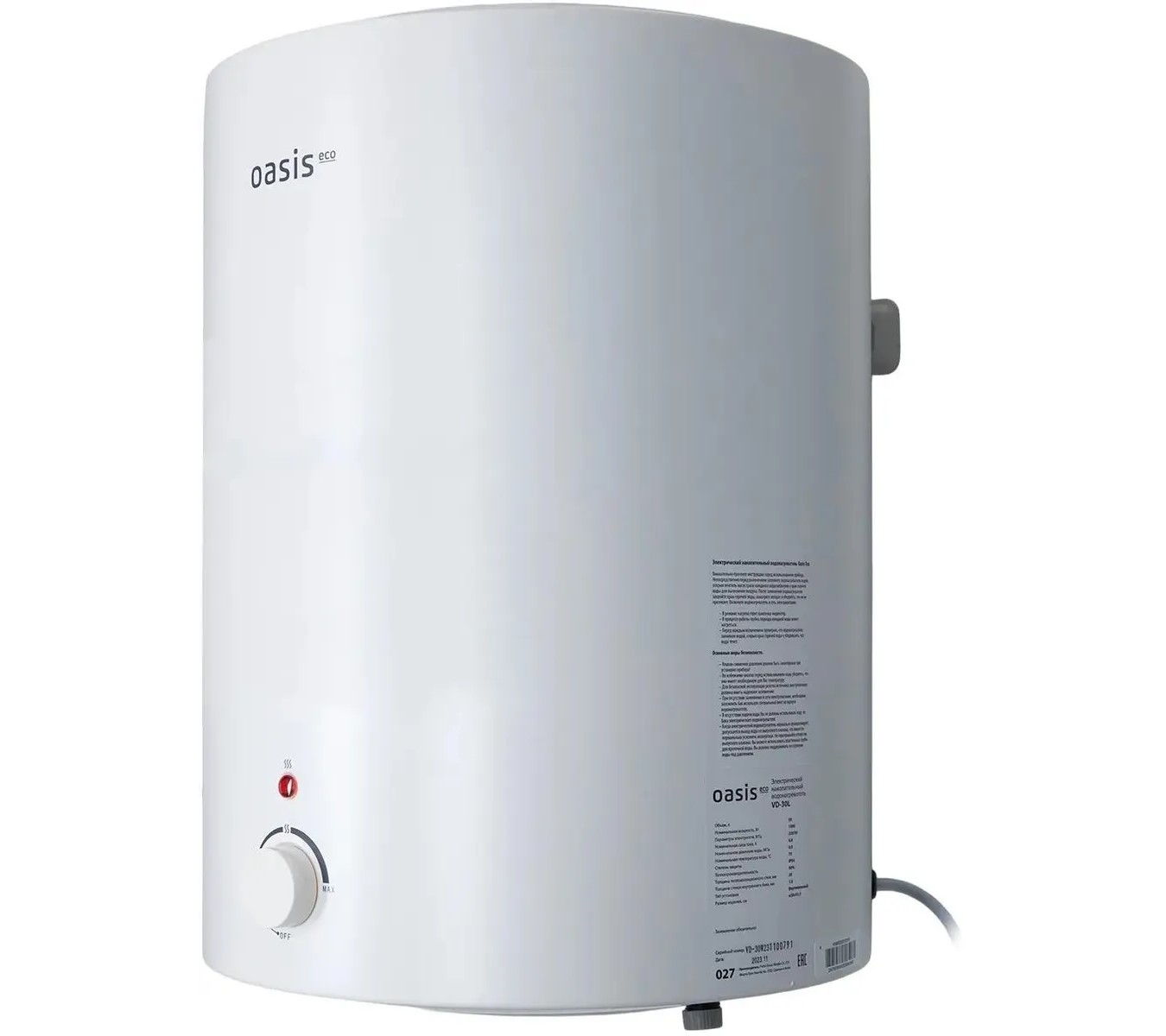 Способ нагрева электрический, Максимальная температура нагрева воды 75 °C, Внутреннее покрытие бака эмаль, Объем бака 30 л, Потребляемая мощность 1,5 кВт, Управление водонагревателем механическое, Электрический нагревательный элемент ТЭН, Мощность ТЭНов 1.5 кВт